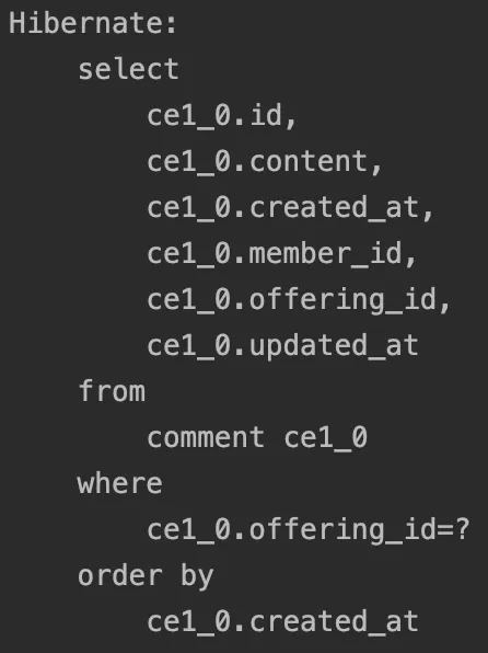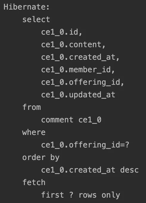 findAllByOfferingOrderByCreatedAt쿼리와 같다. 추가된 부분은 hibernate에 의해 fetch 절이 추가된 점, 정렬이 desc로 설정된 점이라 findAllByOfferingOrderByCreatedAt 와 마찬가지로 인덱스를 추가하지 않아도 될 것이라 판단한다.