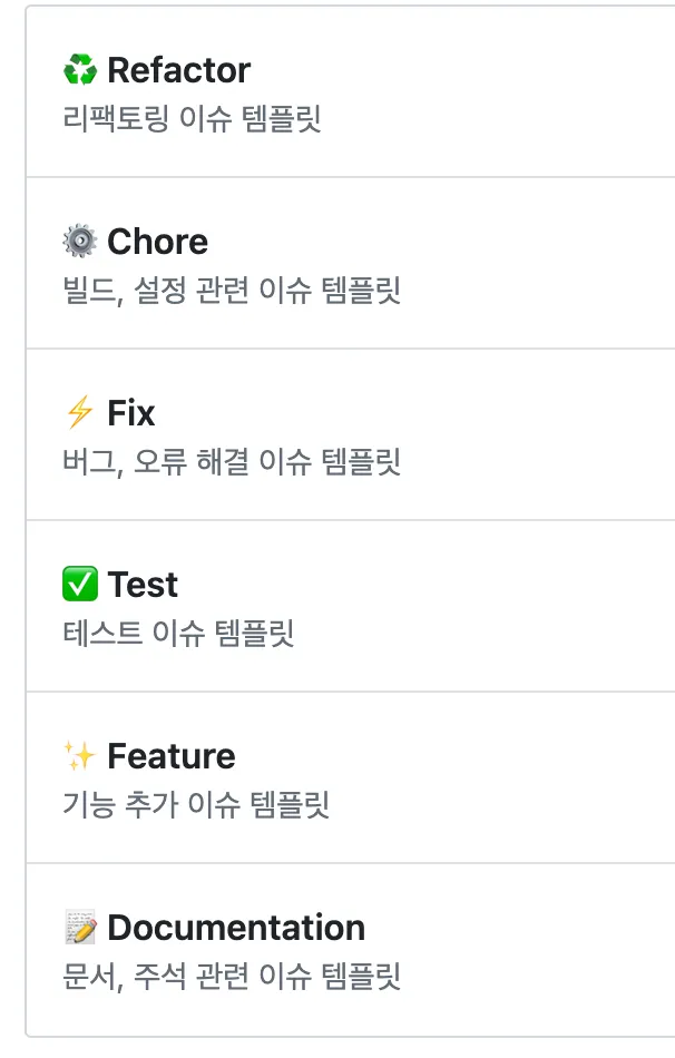 - refactor: 기능과 관련되지 않은 것(기능에 변화 주지 않음). 기능 변화 아닌 코드 리팩토링. 파일 추가/이동/이름 변경/삭제