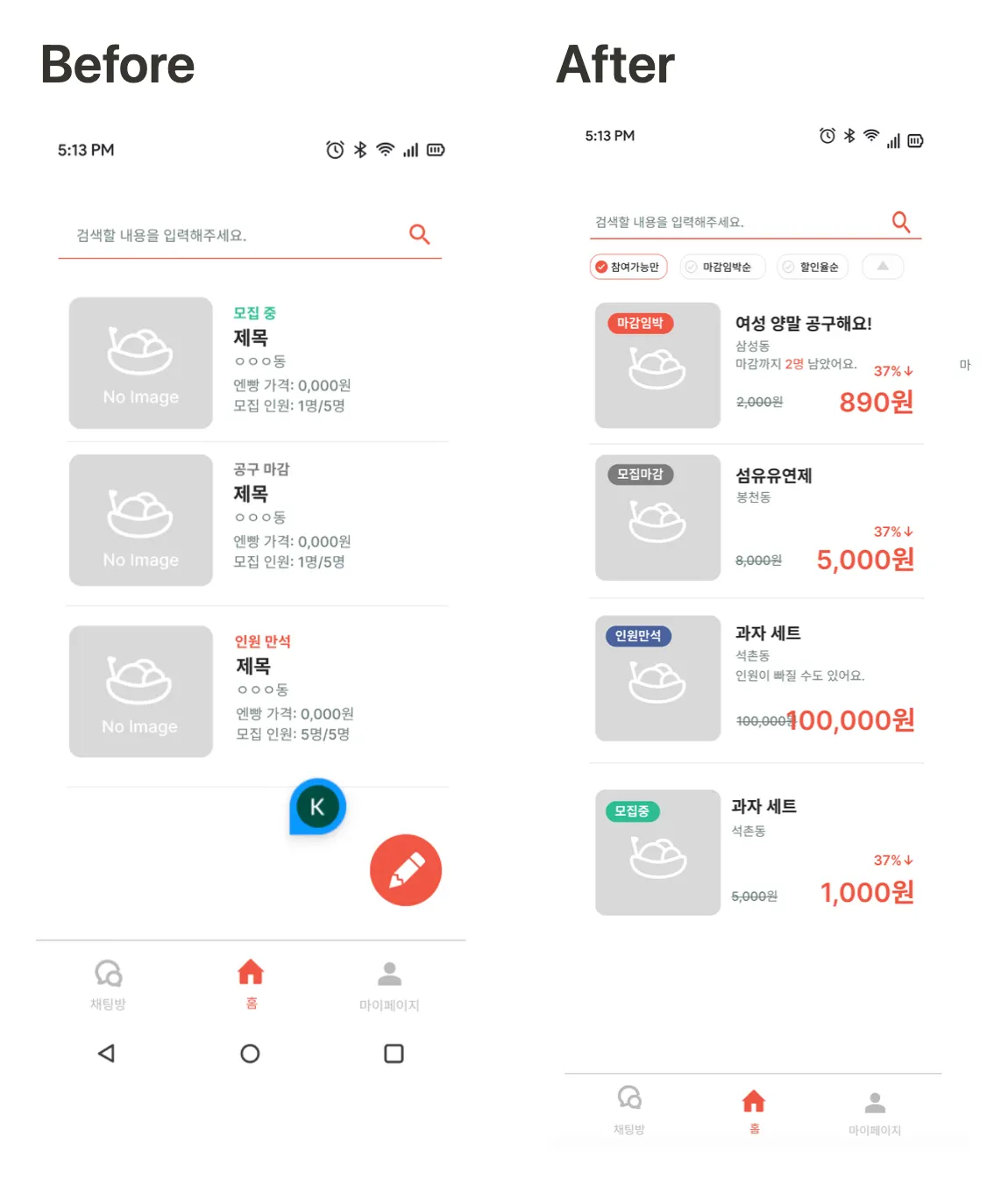 참여가능만/마감임박순/할인율순 의 필터링 사용할 수 있게 해, 공동 구매 참여 유도