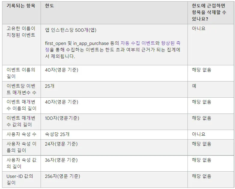 앱에서 데이터를 추가로 수집해야 하는 경우 서로 다른 애널리틱스 이벤트 유형을 최대 500개까지 로깅할 수 있다. 앱에서 로깅할 수 있는 이벤트의 총분량에는 제한이 없다.
