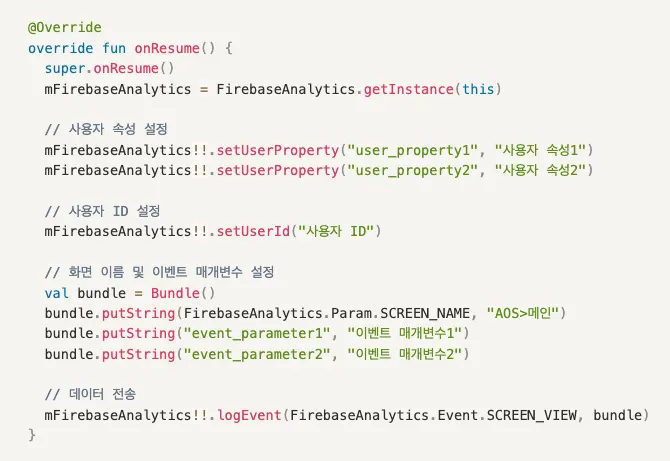Android의 경우 onResume에서 로깅할 수 있다. screen_class를 설정하지 않으면 애널리틱스는 호출할 때 포커스에 있는 UIViewController 또는 Activity를 기반으로 기본값을 설정한다.