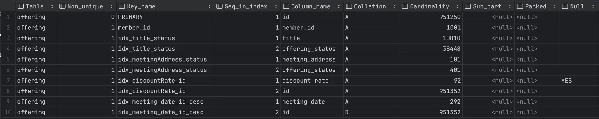 인덱스 추가 (discount_rate, id desc) (meeting_address, offering_status) (title, offering_status)